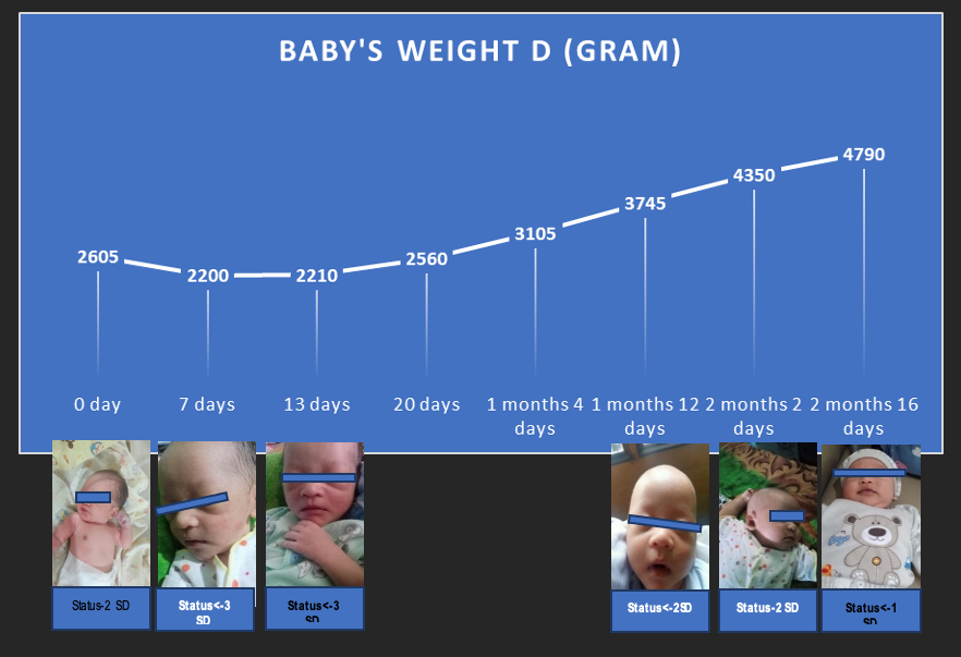 At the next visit on September 22, 2022, Mrs. D told to the doctor that she felt her milk supply was not adequate. Baby D was 1 month and 4 days old, his weight had increased by 37.5 grams per day (from 2560 to 3105 gr). Based on the standard growth curve according to the World Health Organization (WHO), Baby D.’s weight shows improvement from severe malnutrition (Weight < -3SD) to malnutrition (Weight <-2SD). After being explained that the improvement was a good sign by the Pediatrician, Mrs. D was more calm and confident to continue direct breastfeeding.