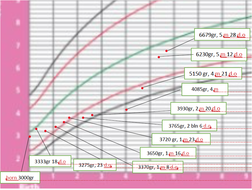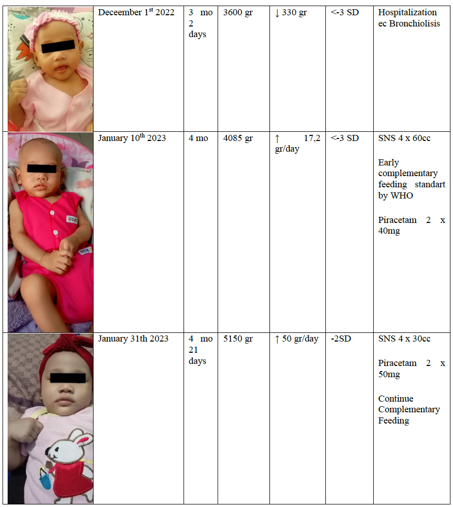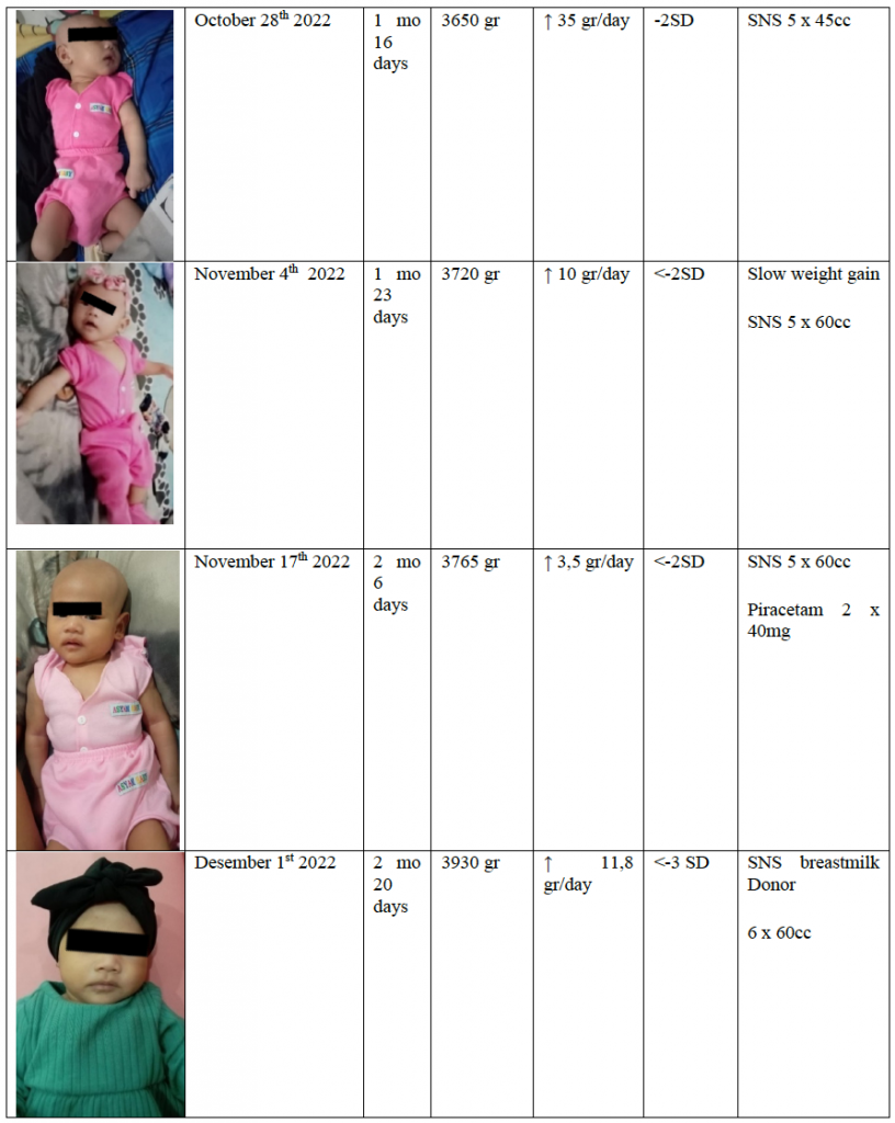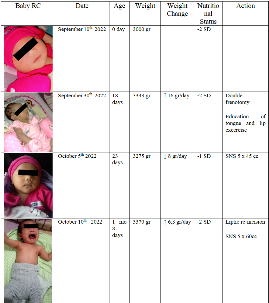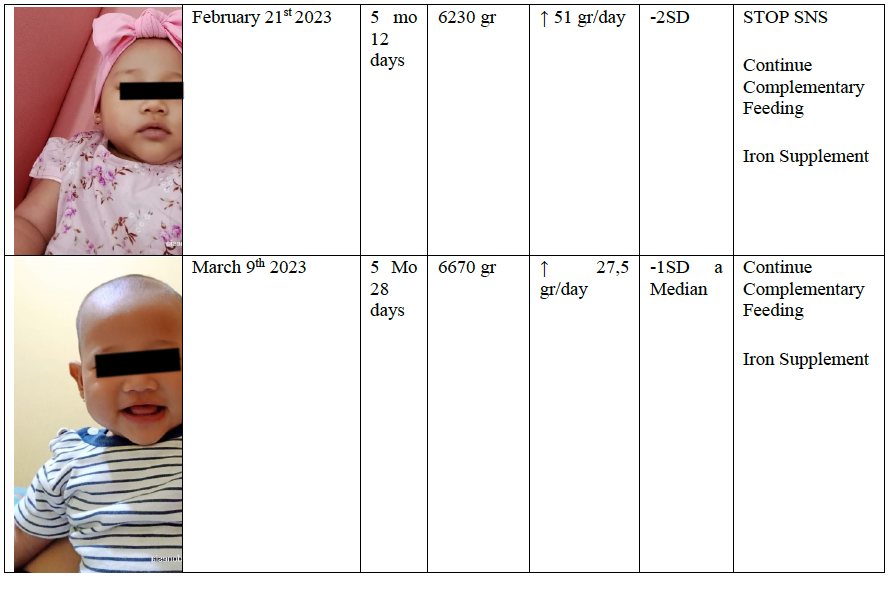 Frenotomy, Supplementation and Early Solid in Malnourished Infants. Written by: dr.Dira Firzanti – Lactation Doctor, Bekasi, West Java, Indonesia Baby RC is the third child of Mrs. S and Mr. I, a baby girl who was born normally at 37-38 weeks of gestation assisted by a midwife at the Beji Health Center, Depok, West Java on September 10, 2022. Baby RC is a term baby (NCB), appropriate for gestational age (AGA) with a birth weight of 3000 grams and a length of 48 cm. The baby was born with strong crying and got early initiation of breastfeeding for 20-30 minutes in the delivery room. She was immediately carried out when the mother was referred to hospital because the placenta had not descended. While Mother was being treated at the hospital, the baby was given formula in a bottle by Mr. I’s sister because the baby was separated from the mother. Mother was treated for 24 hours. After returning home the baby fed directly on the breast but the mother felt that the milk was coming out little by little. The mother felt pain in her left breast, but because the baby was her third child, Mrs. S felt no need to find out the cause and help. During pregnancy, the mother diligently checked her pregnancy at the health center midwife and received lactation education during pregnancy. Mrs. S has 3 children. The first child was 6 years and 9 months, which was breastfed for 2 years and 4 months, the second son was breastfed for 2 years. The mother has a strong desire that her third child, Baby RC, would also get breastfed for 2 years. Mrs. S didn’t work and dad worked in a restaurant. Mrs. S did not have nannies or household assistants and took care of her baby and children at home by her selves. Baby RC visited public health center for control after birth at the age of 1 day to be given the first immunization, and on the 5th day the mother brought baby RC for control because the baby looked yellow. When measurements were taken, the baby’s weight was 3000 grams and the midwife advised the baby to be breastfed more often and have it exposed to the sun light in the morning. On September 30, 2022, Mrs. S brought baby RC for control to pediatrician at the Free Health Institute (LKC) Dompet Dhuafa to get immunized at the age of 18 days with a body weight of 3333 grams. Mrs. S complained that while breastfeeding the baby’s suction often came off, both breasts were swollen and sore, she had a fever for 4 days and her left nipple was bleeding. Mrs. S took 1 tablet of Paracetamol 3 times a day for 7 days and she pumped the sore breast. She also complained that the baby’s urine was little and the baby looked yellow. At the LKC Pediatrician Polyclinic, she met with an IBCLC Pediatrician. A double frenotomy was performed because from physical examination, the baby had a Tongue-tie Submucosa and Lip-tie grade 4. After the procedure, the baby immediately breastfed and the mother was taught tongue exercise and lip exercise to be done every day at home with frequency 5 times a day. She was also advised to breastfeed the baby as the baby desired, day and night. The mother was advised not to pump her breasts. Mrs. S came for control to see the same lactation consultant pediatrician at Puri Cinere Hospital (RSPC) on October 5, 2022, when the baby was 23 days old. At that visit, the baby’s weight was 3275 grams. Mrs. S informed that she felt better when the baby was sucking, and it was painless. The baby’s suction on the breast felt deep and strong. Mrs. S felt that she was producing a lot of milk, but within a few days the frequency of the baby suckling decreased. Mrs. S complained that the baby’s urine was little and more often fussy at night. On physical examination, the baby was not jaundiced, but because the baby’s weight decreased by 58 grams in 7 days, the pediatrician suggested additional supplementation using SNS (Supplemental Nursing System) containing formula milk with partially hydrolyzed protein as much as 5 x 60 cc/day . As for the rest of the time, the baby was suggested to be breastfed directly without SNS with the frequency as much as the baby wants. October 10, 2022 at the age of 1 month and 8 days, the mother brought the baby to the same lactation consultant pediatrician at Permata Depok Hospital (RSPD) because the position of the hospital was closer to where she lived. Mrs. S admitted that she forgot to do one of the lip exercises. The baby’s weight increased by 6,3 grams/day to 3370 grams. The nutritional status of the baby was undernourished (BB/U –2SD). On physical examination, there was reattachment of the upper lip. Therefore, a re-frenotomy lip-tie was performed. Mrs. S were advised to continue using SNS with the same amount. Mrs. S was referred to the lactation poly. The lactation doctor taught the left cross cradle position and recommended that the baby have frequent tummy time. Lip exercises were advised to be carried out 3x/day so that the lip cords didn’t reattached. Breastfeed was advised to be done as much as the baby wants and the use of SNS was continued 5 x 45 cc per day. On October 28, 2022, the baby was 1 month and 16 days old, his weight increased by 280 grams, (35 grams/day) and the weight was 3650 grams, with poor nutritional status (BB/U –2SD). The baby was brought to the lactation consultant pediatrician poly and it was observed that the post frenotomy wound was a good, the mother had lots of milk, the baby was well attached, and it was advised to continue SNS 5 x 30-45 cc per day and use only 1 SNS tube. It was advised to continue breastfeeding the baby as much as the baby wants and to come back to lactation clinic in the next week. On November 4, 2022 baby RC was 1 month and 23 days old. From the examination, it was found that the baby’s weight gain was 10 grams per day. It was increased by 70 grams in 7 days thus the weight at that visit was 3720 grams. Based on the standard growth curve according to the World Health Organization (WHO), baby RC showed
