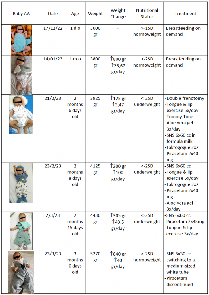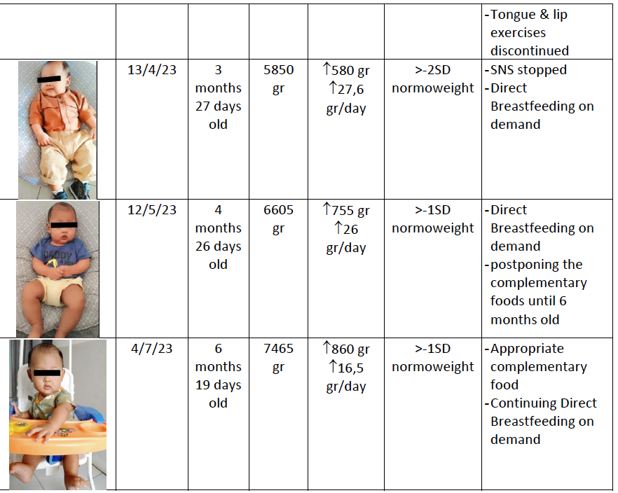 SIMPLE FRENOTOMY AND SUPPLEMENTATION IN INFANT WITH ANKYLOGLOSSIA AND SLOW WEIGHT GAIN PRABORINI LACTATION TEAM ON MARCH 23, 2023 Written by : dr. Mellati Zastia Putri JAKARTA SELATAN CASE REPORT Baby AA, a male, is the first child of Mrs. M and Mr. A. The mother is a midwife, and the father is a member of the Indonesian National Military Naval Force. Baby AA was born through a normal delivery at 39 weeks of gestation, assisted by a midwife on December 17, 2022 with a birth weight of 3000 gram. Immediately after the baby was born, he was given an early initiation of breastfeeding for approximately 30 minutes. During the initiation, the baby was able to find the nipples and began breastfeeding. At the age of 3 days old, Baby AA was brought to a midwife for a check-up due to a yellowish appearance on the face, and the weight was measured to have decreased to 2800 grams (6,8% of birth weight). Mrs. M was concerned that her breast milk might not be sufficient, so she started pumping and providing expressed breast milk using a bottle until the yellowish on the baby’s face disappeared by the age of 1 week. After that, the mother stopped pumping and continued direct breastfeeding. During breastfeeding, she experienced pain and cracked nipples, and had endless duration of breastfeeding as if the baby was never full. When the baby was brought to a midwife at 1 month old, the baby’s weight was 3800 grams (gained 1000 grams). At 2 months old, Baby AA was brought to the midwife again, and the weight increased by 4100 grams (only gained 300 grams). The midwife suspected a tongue tie and referred the baby to a pediatric and lactation consultant. The first visit was on February 21, 2023. Mrs. M came with her husband and Baby AA. She expressed concerns that the baby had endless duration of breastfeeding as if he was never full and the weight gain was not as expected. Additionally, the mother experienced pain and cracked nipple during breastfeeding. At that time, Baby AA was 2 months and 6 days old, and weighs 3925 grams. The baby’s nutritional status was categorized as underweight (<-2SD), nearly approach severely underweight (<-3SD), with a weight gain of 14.01 grams per day since birth, indicating a Slow Weight Gain (SWG). Upon a physical examination by the lactation consultant doctor, it was found that the baby had a medial tongue tie and grade 4 lip tie, and the baby lacked of proper sucking reflex. The mother’s breasts were found to be in normal condition, and her breast milk supply was also normal. During the breastfeeding observation in the cradle hold position, the baby tended to latch onto the nipple and could not properly attach to the breast. After being explained about the importance of breastfeeding according to religion and WHO recommendation, Mrs. M was more strongly motivated to breastfeed until 2 years of age. The intention to breastfeed for 2 years was also supported by the husband. The doctor explained that the tongue tie and lip tie were the cause of the breastfeeding difficulties, leading to slow weight gain. The doctor recommended a simple frenotomy procedure, which the parents agreed to. The simple frenotomy was then performed by the doctor in the lactation consultant’s clinic. Following that, the baby was immediately breastfed. Bleeding ceased shortly after breastfeeding. The mother felt that the baby latched deeper, stronger, more gently, and did not feel pain on the nipple as before. The doctor demonstrated tongue and lip exercises to be performed by the parents 5 times a day for the next three weeks. The parents were advised to provide tummy time to their baby and apply aloe vera gel three times a day under the tongue and lip where the frenotomy was performed. The doctor recommended using a Supplemental Nursing System (SNS) for breastfeeding supplementation and provided instructions for its setup and sterilization. The SNS contained 6×60 cc of formula milk. The mother continues to do direct breastfeeding without SNS as often as the baby wants. Additionally, the doctor prescribed piracetam (2×40 mg) for the baby and a lactogogue (2×2) for the mother. A follow-up appointment was scheduled on February 23, 2023. On the second visit, two days after the frenotomy, Baby AA was 2 months and 8 days old, with a weight gain of 100 grams per day, reaching 4125 grams. The baby’s nutritional status was still categorized as underweight (<-2SD). The post-frenotomy wound examination showed no remaining tissue. Breastfeeding attachment improved, and the mother’s breast milk supply increased. The doctor recommended continuing SNS supplementation (6×60 cc of formula milk), continuing tongue and lip exercises five times a day, lactogogue for the mother, and the piracetam for the baby. A follow-up appointment was scheduled on March 2, 2023. At the third visit on March 2, 2023, the baby was 2 months and 15 days old, with a weight gain of 43,5 grams per day, reaching 4430 grams. The baby’s nutritional status was still underweight (<-2SD). The mother reported that the breastfeeding process was improving, and her breast milk supply was plenty. The doctor recommended continuing SNS supplementation (6×60 cc), reducing tongue and lip exercises to three times a day, and increasing the piracetam dose to 2×45 mg for the baby. Another follow-up appointment was scheduled on March 23, 2023. The fourth visit was on March 23, 2023, the baby was 3 months and 6 days old, with a weight gain of 40 grams per day, reaching 5270 grams. The baby’s nutritional status improved to normoweight (>-2SD). The doctor recommended reducing the SNS dosage to 6×30 cc due to the baby’s good weight gain and switching to a medium-sized white tube. Piracetam was discontinued, and tongue exercises were stopped. Another follow-up appointment was scheduled for April 6, 2023. The fifth visit was on April 13, 2023, the baby was 3 months and 27 days old, with a weight gain of 27.6 grams per day, reaching 5850 grams.
